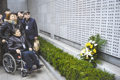 12月10日,在侵华日军南京大屠杀遇难同胞纪念馆,遇难者遗属代表瞻仰“哭墙”上新增姓名。