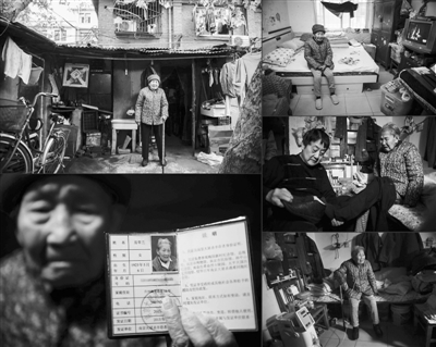 易翠兰在南京临时租住处门前(2016年11月25日摄)(左上);易翠兰展示自己的南京大屠杀幸存者证书(2016年11月25日摄)(左下);易翠兰在南京临时租住的家中(2016年11月25日摄)(右上);易翠兰儿子陶盛福在帮助老人穿戴衣物(2016年11月25日摄)(右中);易翠兰经常依靠制氧机缓解呼吸困难的病症(2016年11月25日摄)(右下)。