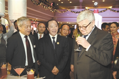 德国前副总理、外交部长约瑟夫·菲舍尔在袁仁国陪伴下,饶有兴趣地品尝茅台鸡尾酒
