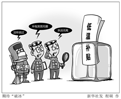 时下正值黑龙江省“嘎嘎冷”的时节,零下十几摄氏度以下的最高气温让这里的户外工作者备受“冷遇”。而对于“低温补贴”,许多户外工作者却知之不多,甚至一些监管部门也表示陌生。尽管如此,接受采访的基层干部和户外工作者还是期待能尽早感受到低温补贴的政策热度。新华社发 程硕 作