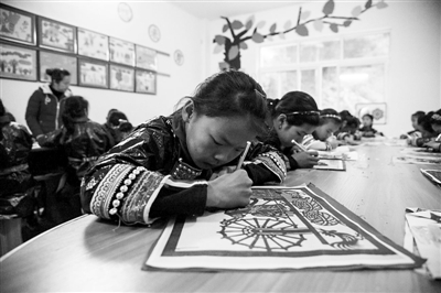12月13日,在贵州省从江县高增乡中心小学乡村学校少年宫,学生们在制作剪纸。