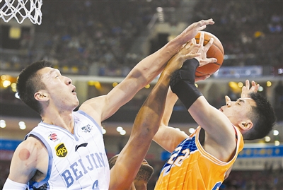 图为北京队孙悦封盖上海队翟逸的上篮。本报记者 许之丰 摄