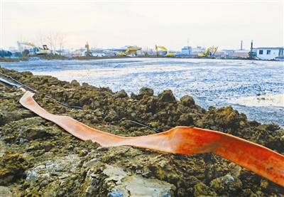 12月14日,江苏省金湖县淮河入江水道滩涂河岸边,近10台大型挖掘机正在开挖位于淮河岸边的金莲造纸厂污水池。