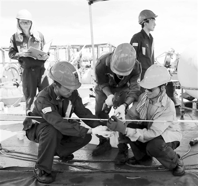 我国远洋综合考察船“科学”号正在西太平洋执行潜标观测网维护与升级任务。截至目前,科考队员已获取了140余件观测设备连续1年的现场数据,维护了8套深海潜标,并重新布放至西太平洋海域。图为“科学”号上的科考队员从缆绳上拆卸观测设备。