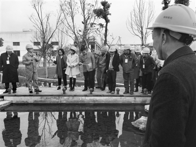 在中国最大的炼化厂镇海炼化厂区,工作人员向参观者介绍处理过的污水饲养金鱼。
