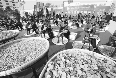 12月17日,在安徽省亳州市,百名药工正在展示中药传统炮制技艺。100多名药工分别展示近百种中药的切、炒、蒸、捡等传统炮制技艺,吸引了国内2000多名中医交流会的中医药界人士观看。张延林 摄/中新社