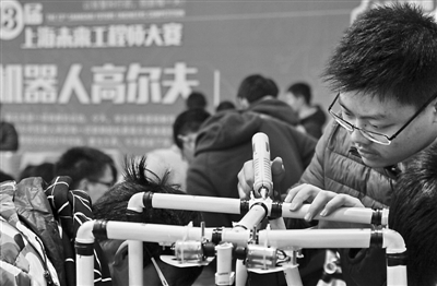 12月17日,上海,参赛选手现场制作高尔夫机器人。当日,主题为“以智慧和行动,创新每一天”的第十三届上海未来工程师大赛在华东师范大学附属枫泾中学举行,来自全市1500多名中小学生参与展示、分享和比拼。庄毅 摄/东方IC