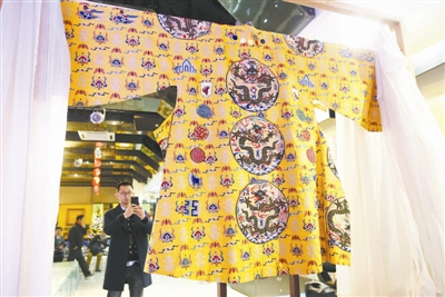 图为参观者被展示的定陵出土文物复制品黄缂丝十二章褔寿如意衮服所吸引。