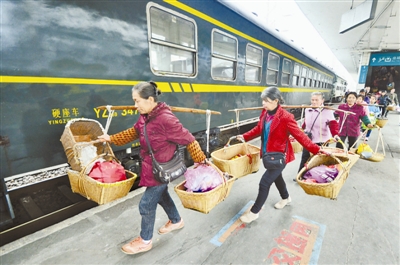 12月18日,湖南郴州火车站,菜农上车准备返程。