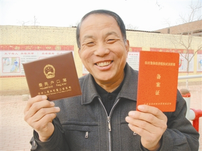 一手拿着《备案证》,一手拿着一家四口的《居民户口簿》, 郭子伟的父亲一脸喜悦。本报记者 丛民 摄