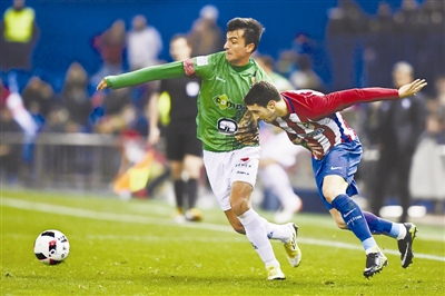 12月20日,马德里竞技队球员福萨里科(右)与吉胡埃洛队球员朱利亚拼抢。