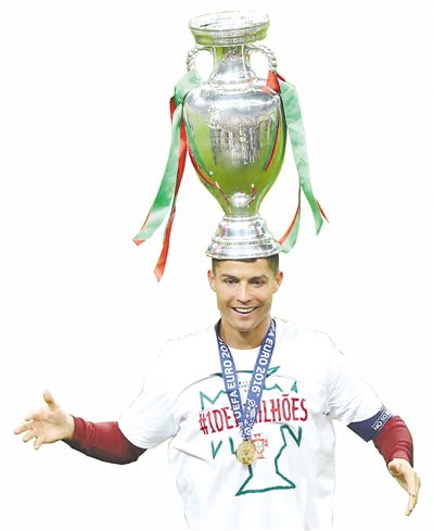 C罗在2016年法国欧洲杯颁奖仪式后头顶奖杯庆祝。新华社发