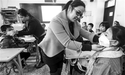 12月20日,廊坊市第九小学的老师教学生佩戴防雾霾口罩。新华社记者 李晓果 摄