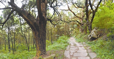 图:位于蜀道金牛道文化线路沿线的文化遗产——拦马墙段的古柏和古道(7月15日摄)。