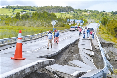 12月25日,在智利奇洛埃省,人们从地震后损坏的公路上走过。智利南部地区25日发生7.6级地震并引发海啸警报。智利国家紧急事务办公室主任里卡多·托罗表示,此次地震未造成人员伤亡。 新华社发