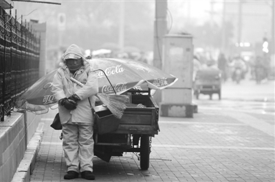 12月26日一早,山东济南,天空中飘着细细的雪花,一位环卫工人靠在路边站着睡着了,还怀抱着扫把和簸箕。据天气预报显示,25日夜间到26日有雨夹雪转中雪,这也将是济南2016年的最后一场降雪。