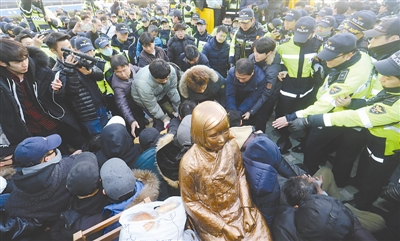 (图为12月28日,韩国民众在日本驻釜山领事馆集会,要求日本就“慰安妇”问题道歉。东方IC 供图)