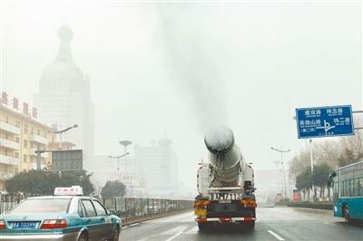 1月2日,一辆降尘车在济南市经十路上进行降尘作业。
