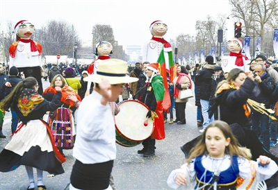 当日,来自世界各地的十几个方阵在巴黎香榭丽舍大街,以盛装游行的方式庆祝新年的到来。 新华社记者 陈益宸 摄