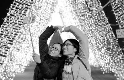 1月2日,游客在衡水湖森林公园灯光展上合影留念。