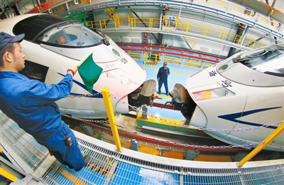 1月4日,在山东青岛北动车所,工作人员指挥动车组进行重联编组。