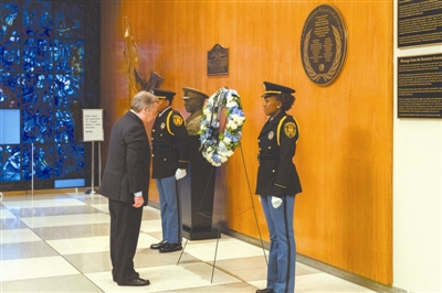 1月3日,在位于纽约的联合国总部,联合国秘书长古特雷斯在殉职的联合国工作人员纪念牌前敬献花圈并默哀。