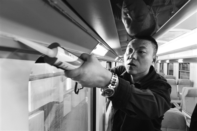 1月3日,呼和浩特铁路局包头车辆段检车乘务员郭伟正在对支南列车车厢灯罩进行检修。