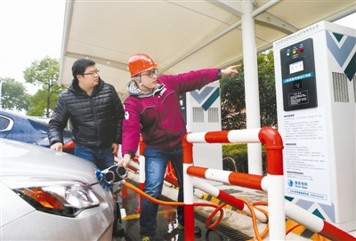 1月5日,在上海市顾戴路一处新能源汽车停车场,国网上海市南供电公司的工作人员(右)在指导市民使用充电桩。