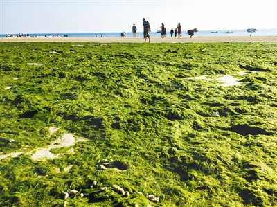 1月4日,广西北海,大量的绿色海藻附着在银滩上,洁白的银滩俨然成为了一片“绿洲”,环卫工人每天要清理的绿色海藻数十吨。