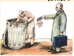 一暴富者遇到流浪汉捡拾垃圾“惨不忍睹”的情景,顿生怜悯之心。他从皮包中掏出丝绒手套递上并叮嘱:千万要讲究卫生!