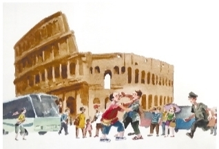 饱经沧桑的罗马竞技场,当年的斗兽表演和奴隶间的角斗早已淡出看台。或许有人觉得未能尽兴,或许遥远的厮杀唤起了两个游客的冲动,结果是,一言不合两个人就掐了起来。于是,“竞技场外”上演了一场让外来“角斗士”丢尽颜面的“真人秀”。