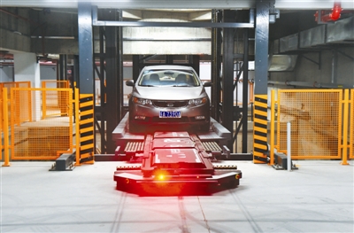 据介绍,该智能停车库采用深圳怡丰机器人公司研发的“激光导航+梳齿交换”式汽车搬运AGV机器人,车主只需将车辆停至出入口,即可离开,车辆通过升降机进入地下,机器人来接车并“搬运”到空余车位上。使用这种机器人停车,取车时间仅需2~3分钟,还可以微信预约车位、一键导航找车,能让传统停车场节约停车位40%以上。秦淮 摄/视觉中国