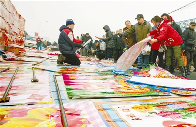 “鸡”年即将到来,有鸡元素的年画十分受宠。年货大集上,年画春联红红火火,市民不愿弄脏年画,不惜跪地挑选买(卖)年画和春联。朱万昌 摄/视觉中国