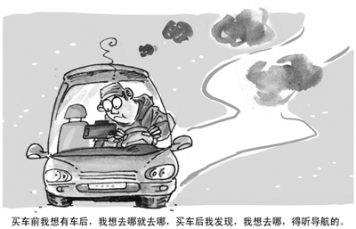买车前想,有车后,我想去哪就去哪;买车后我发现,我想去哪,得听导航的。赵春青 画