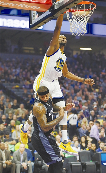 1月8日,勇士队球员凯文·杜兰特上篮(上)被国王队球员考辛斯造犯规。当日,金州勇士队客场以117比106战胜萨克拉门托国王队。新华社/美联