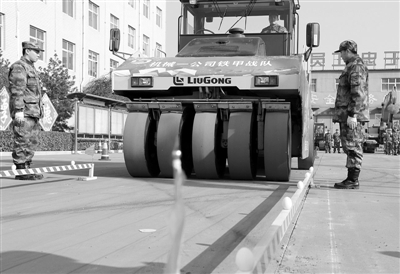 1月10日,在邢台市政建设集团广场,技术工人参加“胶轮压路机过窄路”项目比赛。