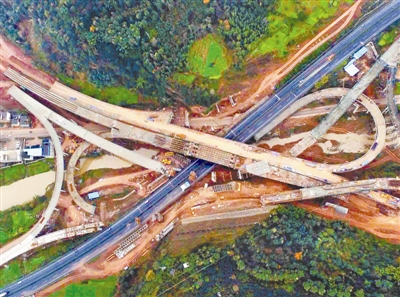 在雅安市雨城区对岩镇的山谷之间,四川省在建最大的互通工程——对岩枢纽互通工程在紧张建设之中(2016年12月26日摄)。