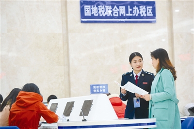 1月12日,在福州市鼓楼区地税局国地税联合网上办税区,企业财务人员(右)向工作人员咨询网上办税事宜。