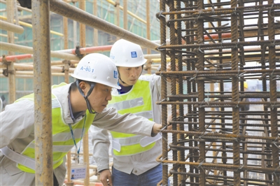 项目经理石峰(左)在施工现场检查工作
