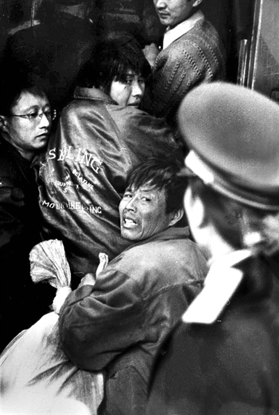 2000年春运,西安,已经挤不上车的乘客央求工作人员别赶他走。本报记者 杨登峰 摄