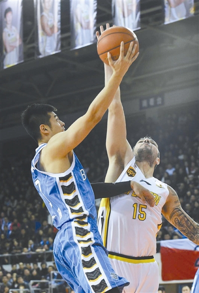 1月12日,中国篮协召开媒体通气会,相关负责人表示,俱乐部和当值技术代表应对此事负责。图为巴蒂斯塔(右)在篮下封盖首钢球员方硕。