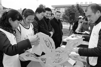 上图为:1月13日,云南省广南县外出务工的乡亲陆续返乡了,该县总工会邀请书画家在广南高铁车站站前广场写春联、画门神,送给乡亲带回家。江艳 摄