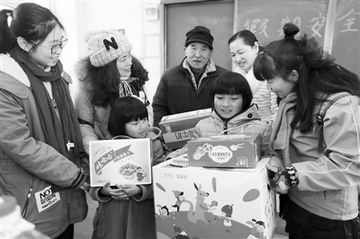 下图为:1月15日,在安徽省淮北市相山区渠沟镇桃园小学,淮北市蒲公英公益协会志愿者为桃园村的贫困儿童分发慰问品。万善朝 摄(新华社发)