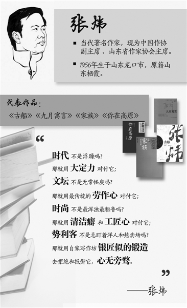 张玮的雄心是有目共睹的。激励了很多年轻作家写作。从文体上,诗歌、散文、童话、小说,他无所不长。他的作品深沉现实,却又极富想象力、立意未来,人们说他写的其实是寓言。他的写作风格不能用一种“主义”来概括,也没有任何一位评论家能够准确而全面的解读他的文学版图。说到成就,他的《古船》《九月寓言》迄今为止,已经有50余种版本,译为英、日、法、俄、韩、德、西班牙、瑞典、塞尔维亚、阿拉伯等多种文字。长篇小说《你在高原》,长达450万字,是迄今为止最庞大的纯文学作品。2011年,获第八届茅盾文学奖。可贵的是,这份雄心熊熊不灭,40年,张玮用作品不断刷新人们对他的认识。