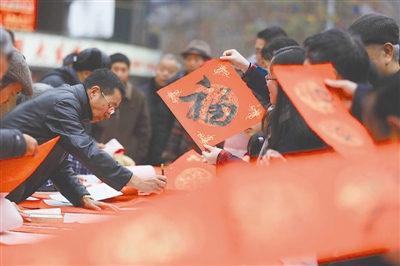 1月14日,重庆市北碚区书法家协会开展“新春送祝福”活动,书法志愿者们义务为居民写春联,将祝福送到居民身旁。  新华社发 秦廷富 摄