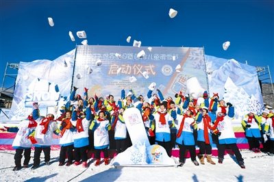 1月15日,2017世界雪日暨国际儿童滑雪节在吉林北大壶雪场度假区及全国25家滑雪场同步举行。图为孩子们在主会场启动仪式上欢呼雀跃。本报记者 袁浩 摄
