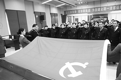 2017年春运开始,郑州客运段高铁二队党总支号召党员乘务员,落实“平安春运、有序春运、温馨春运”要求,严守制度保障旅客安全,提升服务质量当好先锋模范。图为全体党员乘务员在党旗前庄严承诺:安全零失误,标准上规范,形象争最佳,夺取春运首战全胜!张二明 摄