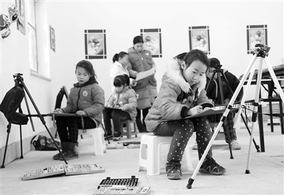 1月16日,志愿者为山西省万荣县闫景村的留守儿童开展美术培训。寒假期间,万荣县李家大院和桥上村关爱儿童之家为村里留守儿童开设美术、音乐、舞蹈等多种课外辅导,帮助50多名留守儿童渡过一个有意义的寒假。李泓晓 摄/中新社