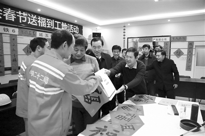 再过几天就是农历新年,中铁二十二局北京地铁6号线西延5标项目建设工地已经年味儿十足,中国铁建书法家协会9名员工书法家齐聚在此,为奋战在一线的建设者义写春联和”福“字,送去吉祥与祝福。(余智 陈聪)
