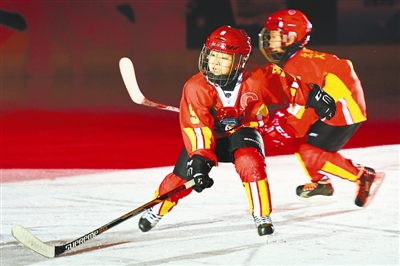 1月18日,来自北京市的小学生在开幕式上表演趣味冰球秀。